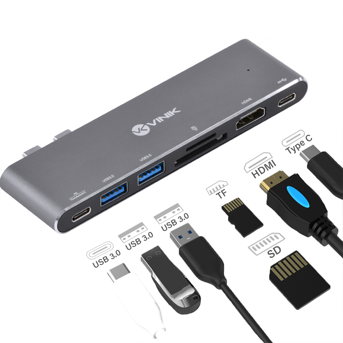 O HUB HC-72 da Vinik permite a extensão de 2 saídas tipo C, ramificando para 2 portas USB 3.0, HDMI, leitor de cartão SD e TF, 1 porta Thunderbolt 3 e 1 porta USB tipo C com Power Delivery de 60W. O recurso Power Delivery permite o carregamento do dispositivo conectado mesmo com o HUB em uso.